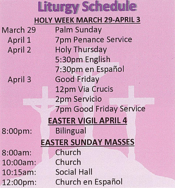 | First Friday | After 9:00 AM Mass to 12:00 PM |